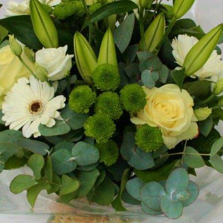 Highly scented white oriental lilies are the focal point of this white and green hand-tied bouquet which also includes, roses, gerberas and lime green chrysanthemums.