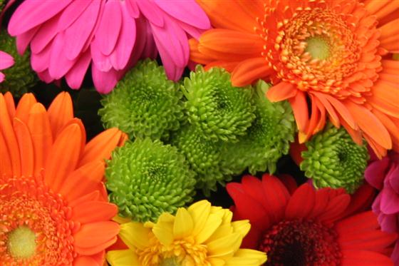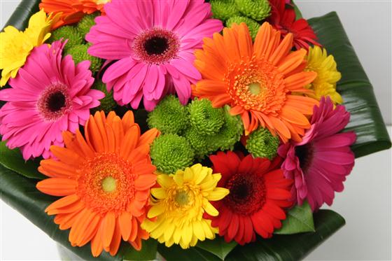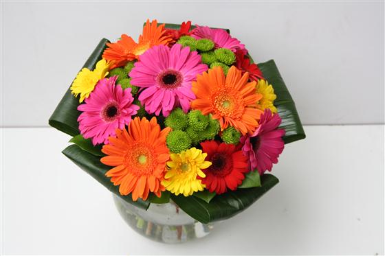 A compact hand-tied bouquet of mixed gerberas in vibrant shades highlighted with lime green chrysanthemums.