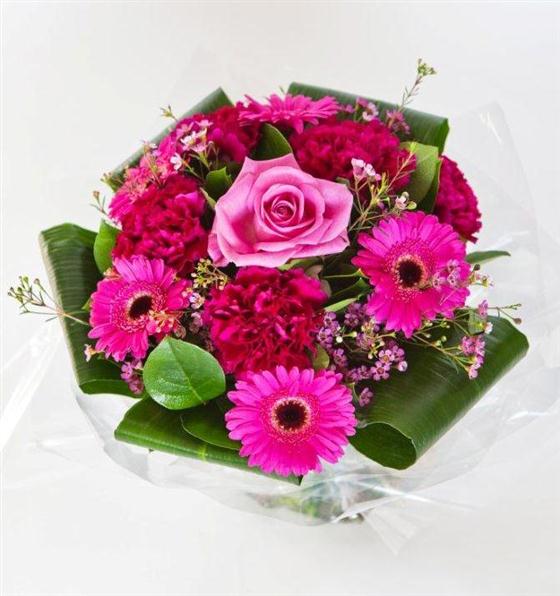 Hot pink gerberas, delicate wax flower and magenta carnations surround a single long stemmed pink rose in this funky bouquet.